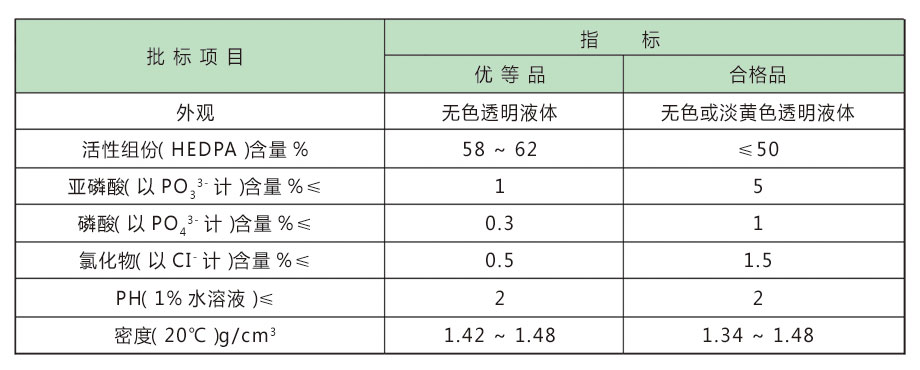 本品為無色或淡黃色透明液體,化學性能穩(wěn)定,在200℃下有良好的緩蝕阻垢作用,抗氯性好,低毒無公害。能與多種金屬離子形成穩(wěn)定的絡合物。